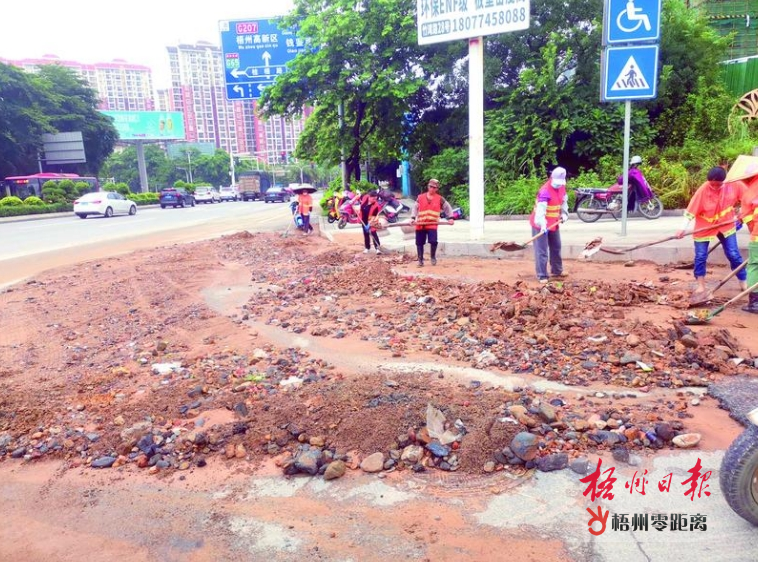 環衛工人在舜帝大道清理堆積的淤泥雜物。梧州日報記者 吳艷虹 攝