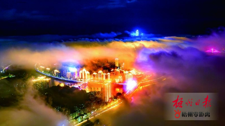 8月5日晚,大雨暫歇,彩色的燈光照亮低空云霧,與水中的倒影相映成趣,把梧州城區裝點得如夢如幻(無人機照片)。