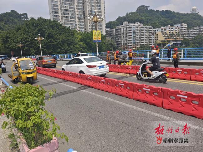 8月12日,桂江一橋半幅車道通過設置水馬,變成雙向單車道,以此減少施工對交通的影響。梧州日報記者 謝韻 攝