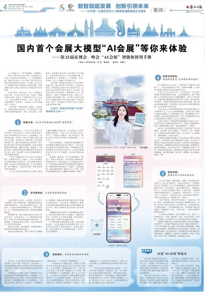 本屆東博會、峰會突出“讓人工智能成為辦會主角、企業成為參會主體”的特點,明確以建設中國—東盟人工智能創新合作中心為切入點,推動會展數字化轉型。由此,國內首個會展智能體“AI會展”上線運營,成為本屆盛會的一大亮點。