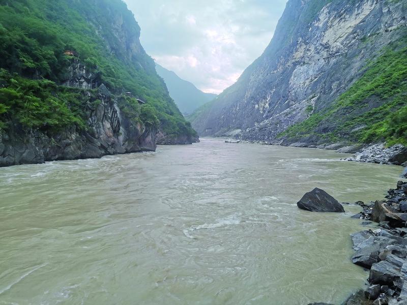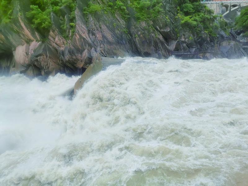 金沙江從狹窄的峽谷中奔騰而下,水勢洶涌濤聲如雷,與峽谷里的雨聲、風聲交織在一起,構成了撼人心魄的壯美自然景觀。