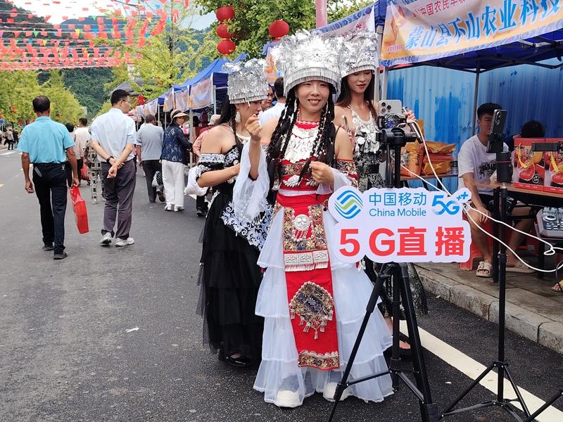蒙山縣“中國(guó)農(nóng)民豐收節(jié)”暨夏宜瑤族鄉(xiāng)經(jīng)濟(jì)社會(huì)高質(zhì)量發(fā)展活動(dòng)中開(kāi)展5G網(wǎng)絡(luò)直播。