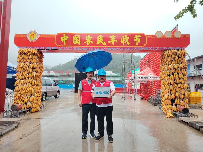 網(wǎng)絡(luò)技術(shù)人員在蒙山縣“中國(guó)農(nóng)民豐收節(jié)”暨夏宜瑤族鄉(xiāng)經(jīng)濟(jì)社會(huì)高質(zhì)量發(fā)展活動(dòng)中測(cè)試網(wǎng)絡(luò)。