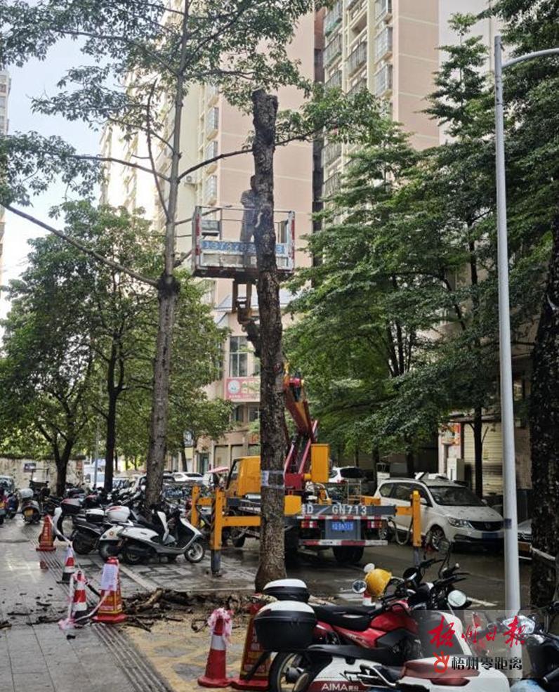 社區(qū)在了解到這一情況后,第一時間啟動響應機制。社區(qū)工作人員聯(lián)合小區(qū)物業(yè)、業(yè)委會成員迅速趕到現(xiàn)場,對存在問題的枯樹木設置了臨時安全警示區(qū)。由于樹木修剪、移除涉及專業(yè)作業(yè)和資金問題,社區(qū)積極發(fā)揮“橋梁”作用,多次組織小區(qū)物業(yè)、龍圩區(qū)建管局等部門及相關業(yè)主進行協(xié)商,共同商討最佳處理方案。經(jīng)過不懈努力,最終確定了由該小區(qū)物業(yè)公司聘請專業(yè)施工隊伍進行作業(yè)的解決方案。