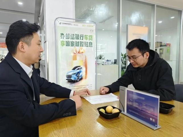 郵儲銀行荊門市分行客戶經(jīng)理為購車客戶介紹消費貸款財政貼息政策。