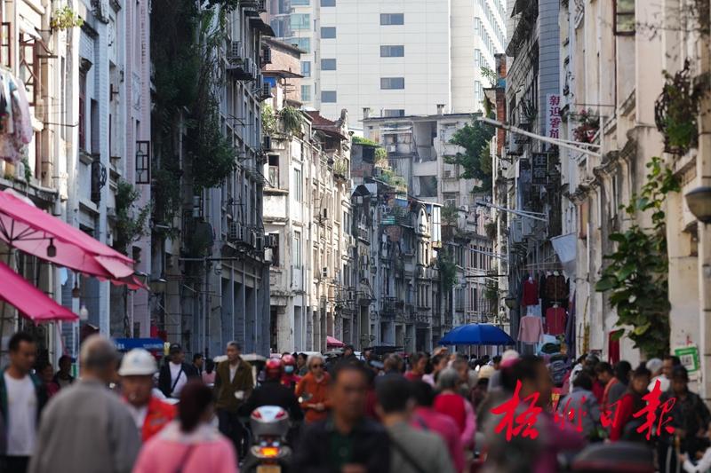 的老建筑群中,街道熙熙攘攘的人群、此起彼伏的叫賣聲,交織成一幅富有生活氣息的畫卷,展示百年騎樓的現代芳華。記者 楊揚 攝