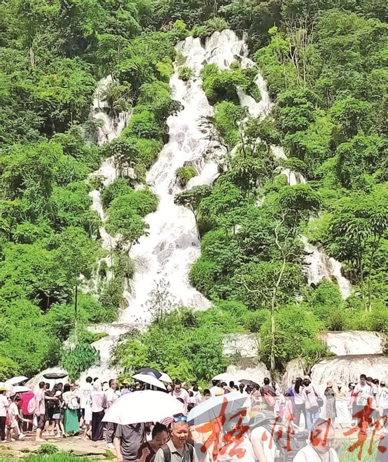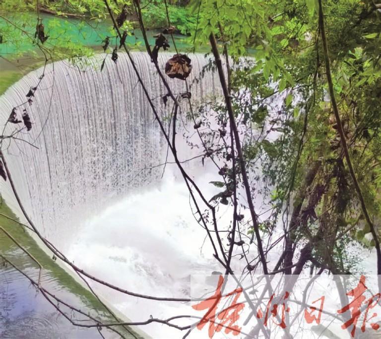 “六十八跌”令人驚。穿過拉雅瀑布,駐足響水河畔,觀賞震撼的“六十八級跌水瀑布”。這條1.6公里的河段,落差竟達110米,寬約40米。青苔斑駁的石階蜿蜒而下,水聲漸次清晰,待轉過山坳,一簾銀紗便撞入眼簾。水流從百米高的崖壁傾瀉而下,撞碎在墨綠色的深潭里,濺起的水霧裹挾著松香撲面而來。瀑布水面時寬時窄,水流時而急促狂瀉,時而平坦舒緩,水的顏色也隨著不同的狀態而變化,在這樣的詩情畫意中,我們感受到擁抱大自然的親切。一路往下一路奇觀,清澈如鏡的涵碧潭水把群山、古樹、橋景、扁舟、綠蔭一并印入水中,倒影粼粼,波光爍爍,山水潭景,分外迷人,這是令游客流連忘返的絕佳景致。