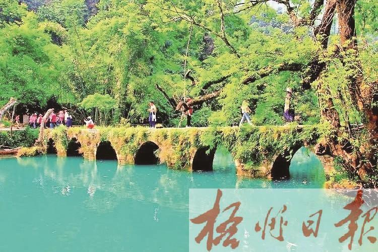 小七孔橋令人迷。小七孔橋又稱響水河橋,橋長25米。古色古香的小七孔拱橋,橋身爬滿藤蔓和蕨類,橋下是綠得令人心醉的涵碧潭。兩岸古木參天,巨大的虬枝沿著橋伸臂,宛如巨傘撐在橋上。