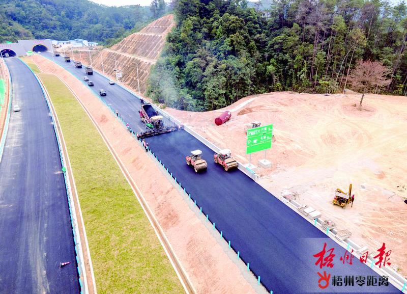 近日,記者走進中國建筑投資建設運營的蒼昭高速公路六堡3號隧道附近路段施工現場,只見滾燙的瀝青伴隨著升騰的白色煙氣傾瀉而出,施工人員在攤鋪機、壓路機等設備的配合下,將瀝青混合料均勻鋪設在路面上。