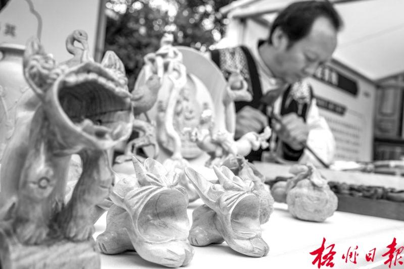 11月23日,劍川木雕省級傳承人楊煥培在2025非遺品牌推廣周上制作木雕。