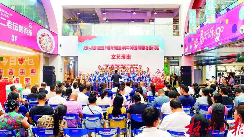 長洲區(qū)政協(xié)、長洲區(qū)委統(tǒng)戰(zhàn)部聯(lián)合主辦的“慶祝人民政協(xié)成立75周年暨建設(shè)鑄牢中華民族共同體意識(shí)示范區(qū)”文藝演出在百盛廣場(chǎng)上演。 李靜 攝