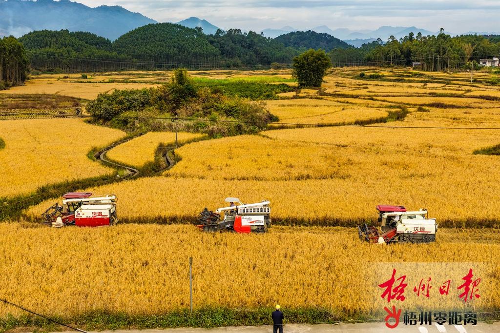 今年,蒙山縣擴大晚稻種植面積,通過種植高產優質遲熟晚稻品種,實現穩產增產。近日,桃垌村種植的300畝遲熟晚稻普遍成熟進入收割期,當地農戶集中使用多臺高效率聯合收割機,搶收遲熟晚稻。 江永錄 攝