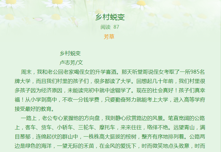飄香的鹿伏嶺 迷人的梯田“茶場”作品說明:文章娓娓道來,用獨特的視覺創作了這篇文章,讀者身臨其境,跟著文章去旅行,去品味蘊藏在鹿伏嶺山上的竇家司墓及其后人的那段歲月流光,去欣賞今非昔比后漫山遍野里茶葉的嫩芽新綠與馥郁芳香,去領略新時代里大益人在脫貧路上“一個也不能落下”的動人情懷。