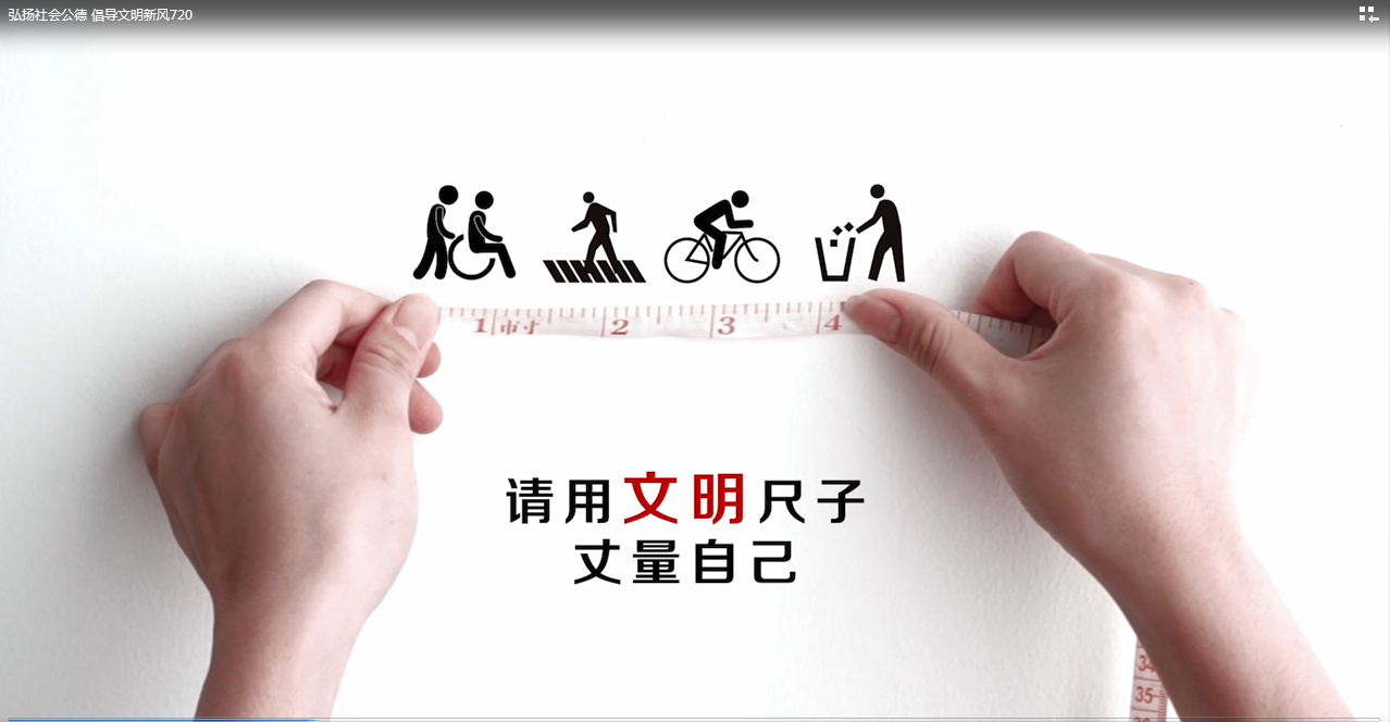 弘揚社會公德,倡導文明新風作品說明:生活中的文明行為是衡量公民道德修養的重要尺度,公益廣告以文明行為用尺衡量來宣傳樹立良好行為規范的重要性。