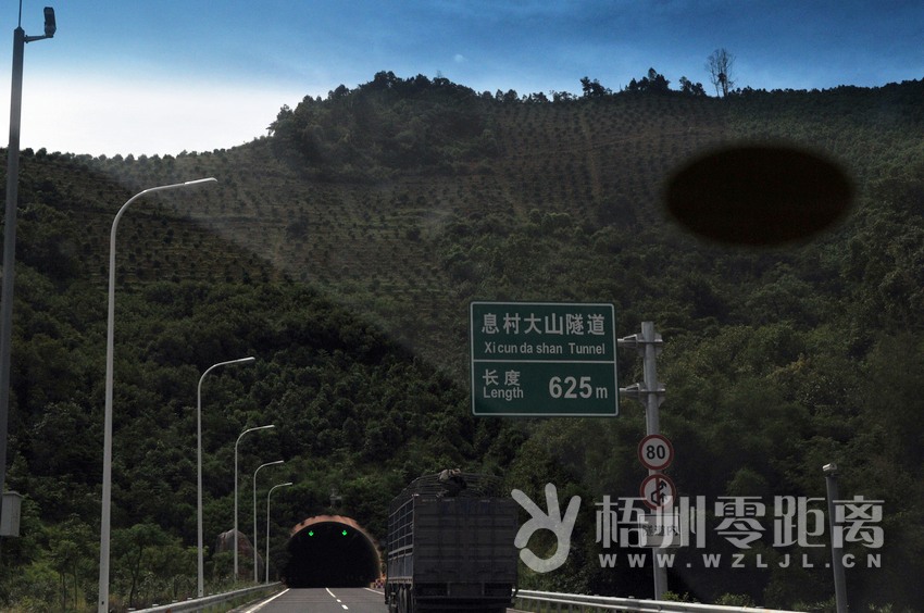 - 旗山頂隧道,長度1952米,距離蒼梧收費站68.5公里,連灘7公里、云浮47公里、廣州187公里