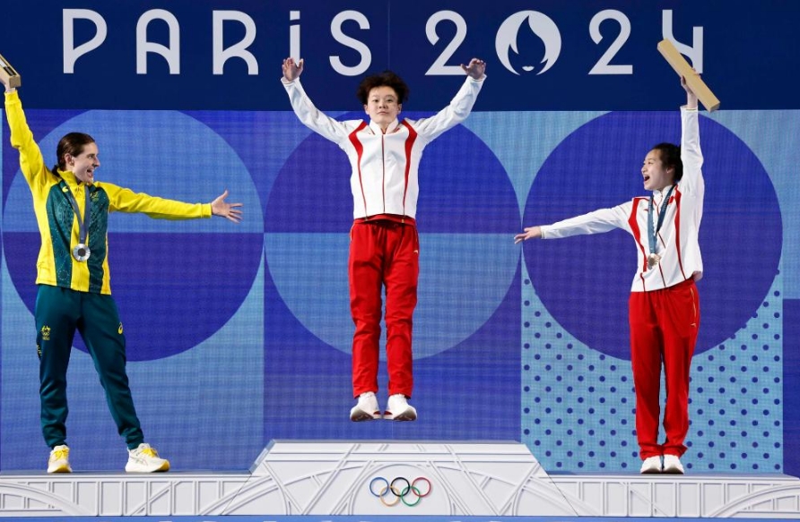 7月29日的巴黎奧運(yùn)會(huì)跳水男子雙人十米臺(tái)比賽頒獎(jiǎng)儀式上,練俊杰和楊昊一起跳上最高領(lǐng)獎(jiǎng)臺(tái),高舉雙臂做出“第一”的手勢(shì)。