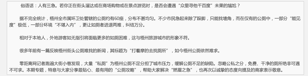 走訪結果顯示,梧州本地旅游景點如廁問題并不太嚴重,一方面公廁分布合理,第二標志相對明顯,游客可放心不怕三急。