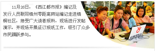12月8日,梧州日報、梧州零距離網站“‘走基層、轉作風、改文風’基層大走訪系列活動”來到岑溪市,頂著驟然降溫降雨的天氣,熱心的讀者和網友早早守候在活動現場,等待著編記人員到來。