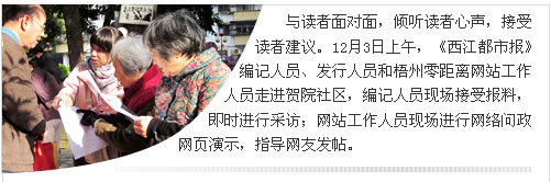 2012年2月18日上午,梧州日報、零距離網站“‘走基層、轉作風、改文風’基層大走訪系列活動”繼走進藤縣、蒼梧縣、岑溪市后,首次來到了蒙山縣。盡管當天春寒料峭,最低氣溫不到10攝氏度,但寒冷卻擋不住蒙山群眾的熱情。當天,讀者群眾把設在梁羽生公園前的活動現場圍了個水泄不通,坦誠向現場記者傾訴自己的問題與建議,與在場的編記們一如老友見面般熟絡。就群眾現場反映的部分問題,記者立即展開深入采訪,詳細了解事情的來龍去脈,為群眾排疑解惑。