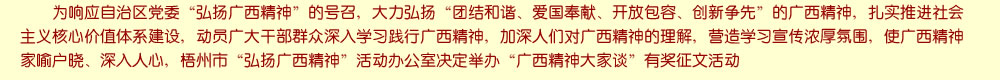 | | | 2011年底,自治區(qū)黨委和自治區(qū)人民政府為了推進(jìn)廣西經(jīng)濟(jì)發(fā)展,從而更好地建設(shè)和諧廣西,提煉出了鼓舞人心的廣西精神———“團(tuán)結(jié)和諧、愛國奉獻(xiàn)、開放包容、創(chuàng)新爭先”。筆者認(rèn)為,廣西精神完全符合八桂大地的發(fā)展現(xiàn)狀,就梧州而言,“開放包容”更具針對性,需要市民認(rèn)真學(xué)習(xí),深刻領(lǐng)會,并貫徹到實(shí)際的工作與生活中去。[詳細(xì)點(diǎn)擊] | | | | | | | 自治區(qū)黨委書記郭聲琨同志在廣西第十次黨代會報(bào)告中首次提出“團(tuán)結(jié)和諧、愛國奉獻(xiàn)、開放包容、創(chuàng)新爭先”的“廣西精神”,這對激發(fā)壯鄉(xiāng)兒女熱情,凝聚發(fā)展力量,起著巨大的鼓舞和號召作用。讓“廣西精神”成為梧州跨越式發(fā)展中廣大黨員干部乃至全市人民的自覺行動(dòng)是我們踐行“廣西精神”的必然要求。[詳細(xì)點(diǎn)擊] | | | |