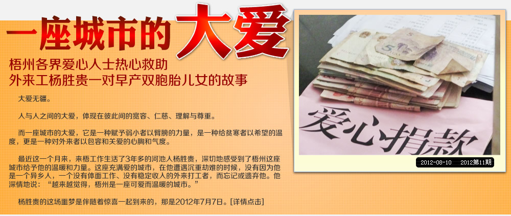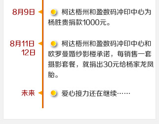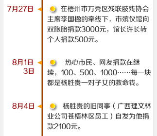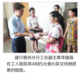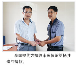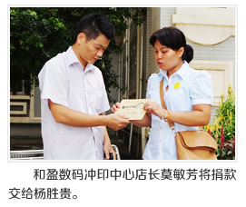江爵琳是柯達梧州和盈數碼沖印中心的老板,他從朋友處了解到楊勝貴的情況后,馬上聯系了梧州零距離網的編輯,表示愿以沖印中心的名義,捐1000元給楊勝貴。