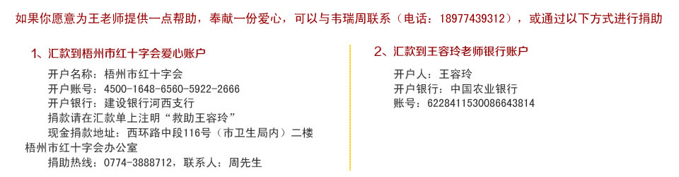 據了解,王容玲每月到手的工資約有1900元,丈夫韋瑞周比她多200元。2007 年,夫婦二人按揭買了一套80平方米二手房,一家三口終于有了屬于自己的房子,雖然身負房貸壓力,但也感到很滿足。豈料,病魔的侵襲,讓王容玲夫婦剛還了房債,又背上藥債,持續三年的治療,已經花光王容玲夫婦的所有積蓄,2012年底,夫婦二人不得不把房子賣掉以支付醫藥費用,搬回學校宿舍居住。