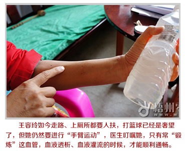 “如果不做血液透析,連胃口也沒有。”王容玲說,做完血液透析之后會感到很饑餓,她一天要吃5餐,但很多東西王容玲不能吃,水也不能喝,只能吃豬肉、青菜等清淡的食物,對于王容玲來說,能吃什么并不重要,重要的是自己還能做什么。曾經身兼英語教研組組長、年級主任、班主任三職于一身的她,如今忽然“閑”下來,王容玲有好幾個晚上都睡不著覺。