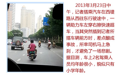 事發時,正在路邊值勤的民警迅速攔下第一輛摩托車,車上搭乘3人,司機為無證駕駛,第二輛摩托車迅速逃逸。警方次日將逃逸司機吳某抓獲,據了解,吳某未滿18周歲,為無證駕駛,事發時,車上搭載2人。據肇事者自己估計,2輛車的時速均在70公里以上,遠超過西堤路限速的50公里。 |