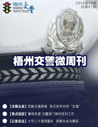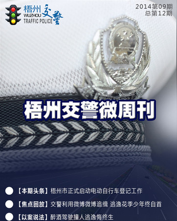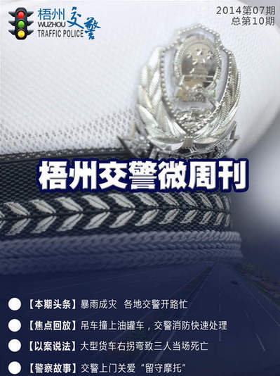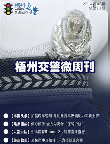 | | 2014年第9期【梧州交警微周刊】出爐啦。梧州市電動自行車正式邁入上牌時代;交警利用微博微信手段,肇事逃逸少年終肯自首;電動車登記時沒有購車發票腫么辦等精彩內容等著你。歡迎大家圍觀![詳細] | |  | | 2014年第8期【交警微周刊】出爐啦。梧州市區燃油助力車將要上牌,您怎么看?交警蜀黍端午、高考護航忙開鍋;套牌寶馬瘋狂違章數十起終落網;哪種違法犯罪行為將被終身禁駕等精彩內容等著你。[詳細] | |  | | 2014年第7期【交警微周刊】出爐啦。各地暴雨成災看交警如何開路;“90后”油耗子瘋狂作案、多地警察聯合擒拿歸案;申請人有吸食或注射毒品行為的能否申請駕駛證等精彩內容等著你。[詳細] | |