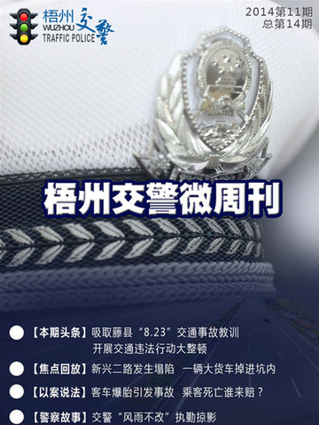 | | 【廣西梧州交警微周刊】2014年第12期新鮮出爐啦。梧州創建文明城市,交警著手整治交通亂象;開學季,交警把交通安全教育送進校園;想開大車,你知道申請大中型客貨車駕駛證有什么限制條件嗎?歡迎大家圍觀!希望大家關注廣西梧州交警微博和微信(gxwz122),多多批評和提供建議。?[詳細] | |  | | 2014年第11期【梧州交警微周刊】出爐啦!藤縣發生較大道路交通事故,梧州交警迅速處置;長洲區夢之島對出路段發生地陷,一輛大貨車被“吞”;9月1日起新車六年免檢新政知多少等精彩內容等著你。歡迎大家圍觀!希望大家關注廣西梧州交警微博和微信(gxwz122),多多批評和提供建議?[詳細] | |  | | 2014年第10期【梧州交警微周刊】出爐啦。梧州市燃油助力車正式邁入規范管理時代;日產小車出路口不看路,撞上奔馳SUV吃大虧;燃油助力車登記時沒有購車發票腫么辦等精彩內容等著你。歡迎大家圍觀!希望大家關注廣西梧州交警微博和微信(gxwz122),多多批評和提供建議。[詳細] | |