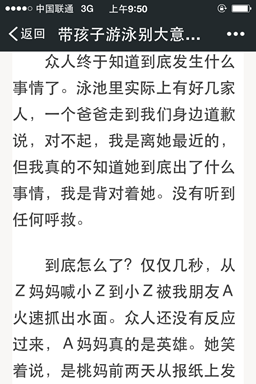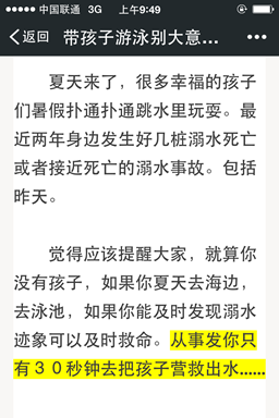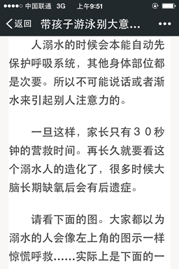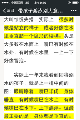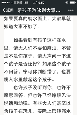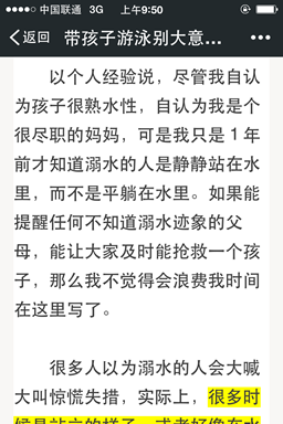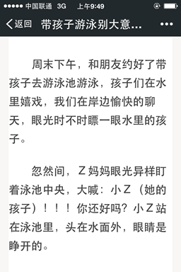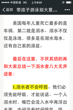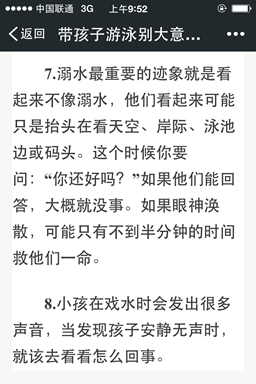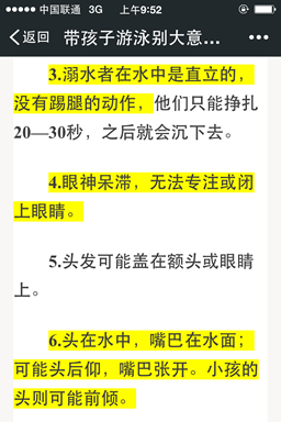 近日,微信公眾號熱傳網帖《多數溺水的孩子站在水中安靜地死去》。帖子稱,很多家長不知道,孩子溺水時,不一定都是拼命掙扎,也可能只是靜靜地站在水里,家長一旦錯過搶救最佳時機,會導致孩子大腦長期缺氧并留下后遺癥。對帖子中的觀點,梧州市游泳場資深救生員李教練稱“有可能發生”。