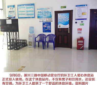今年9月份,梧州市農(nóng)民工工作和統(tǒng)籌城鄉(xiāng)就業(yè)工作領(lǐng)導小組辦公室,聯(lián)同梧州市市政管理局發(fā)出倡議,在市內(nèi)有條件的單位企業(yè)設立“環(huán)衛(wèi)工人愛心休息站”,免費為環(huán)衛(wèi)工人提供飲用水、坐椅及基本生活服務設施等。