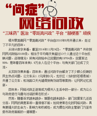 ????改進5:市長信箱分為三大板塊 ????改版后,市長信箱將分為政府信箱、為梧州發展建言獻策和市長熱線三個專題版塊。其中,“政府信箱”是梧州市政府及其各部門與民溝通、提供高效快捷服務的統一窗口。市民群眾可以通過這個窗口直接向市政府及其各部門發送政風行風投訴或建議、問題咨詢、情況反映、表揚等留言;“為梧州發展建言獻策”欄目為網友們提供向市政府反映問題、提出建議和意見的渠道,市政府督查室將對網友反映比較集中的一些問題進行整理、分析、篩選,請有關單位處理、答復,并在“為梧州發展建言獻策”欄目上公布處理結果;網友通過市長熱線反映的具體問題,市政府將要求相關部門及時核實,妥善處理。 ????改進6:增設“網帖回復”欄目 ????改版后,“零距離問政”平臺將增設“網帖回復”欄目,將一些發布在“零距離問政”以外本地論壇、微博、微信等互動平臺的問政貼,由有關部門回復后統一發布在“網帖回復”欄目。 | ||