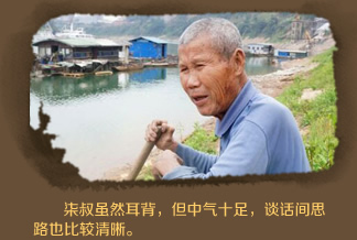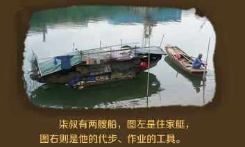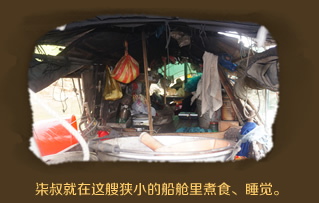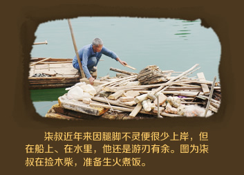 柒叔所擁有的全部,只有那條不足3米長的小蓬船,這就是他遮風(fēng)擋雨、生活起居的唯一場所。船尾圍了一個(gè)火爐,是燒火吃飯地方,船中搭著幾塊板,是睡覺和起居的處所。船外掛一個(gè)水桶,用來洗臉擦身。柒叔還在小蓬船旁邊搭了一個(gè)浮臺(tái),上游不時(shí)會(huì)漂下一些樹枝或者木塊,柒叔把它們撿回來放在浮臺(tái)上晾曬,曬干后就可以用來生火。柒叔的家當(dāng)十分簡陋,無非只是些鍋碗瓢盆,他甚至都沒有一床厚棉被,船里只散落著幾件薄外套。