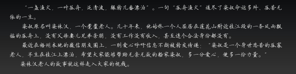 在柒叔凄苦的一生里,除了柒嬸外,他最大的幸運(yùn)便是遇到了陳姨。陳姨是在柒叔附近一艘船舶上工作的好心人,自從柒叔上了年紀(jì)以后,陳姨就一直無私地照顧著這個(gè)老人,老人缺衣少食,她就會(huì)買些大米、雞蛋、牛奶、衣服送給他。逢年過節(jié),陳姨還會(huì)專門斬半邊雞給老人,讓他過個(gè)好年。柒叔總是滿懷感激地說:“我這十幾年來的生活,都是多虧了陳姨啊。”