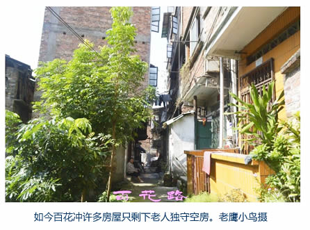 百花沖里曾經那些密密匝匝的小樓房,如今大部分都只剩下老人獨守著老舊的空房,每逢起風下雨,雨水敲打著自家的樓房屋頂,水流從山上沖刷而下,“心里總是害怕的”,莫大叔說。