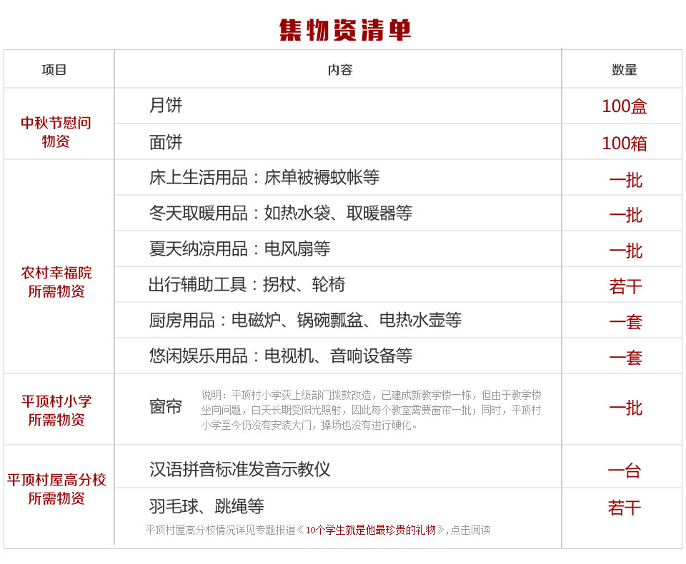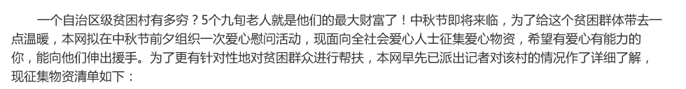 然而,要讓老人們在幸福院里生活得舒適,還需要更多生活用品的配備,比如蚊帳被褥等生活必需品,還有廚具、熱水設備、電視等家電家具,“為了讓五保戶以及有需要的困難老人盡快入住幸福院,希望社會各界有愛心有能力的人能伸出援手。”董曉軍說。 |