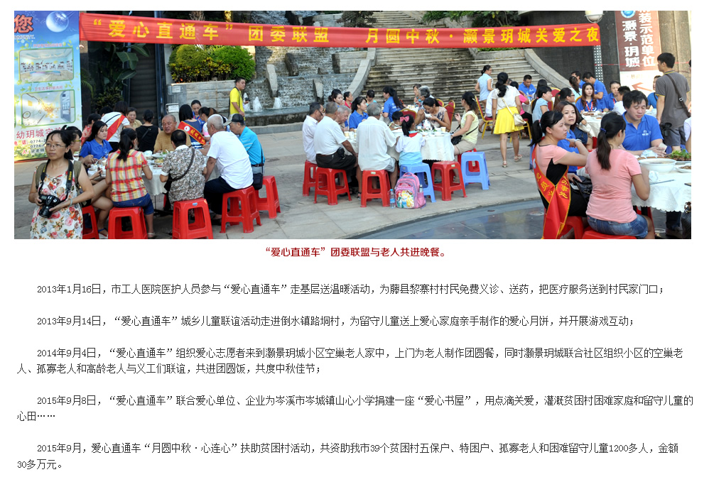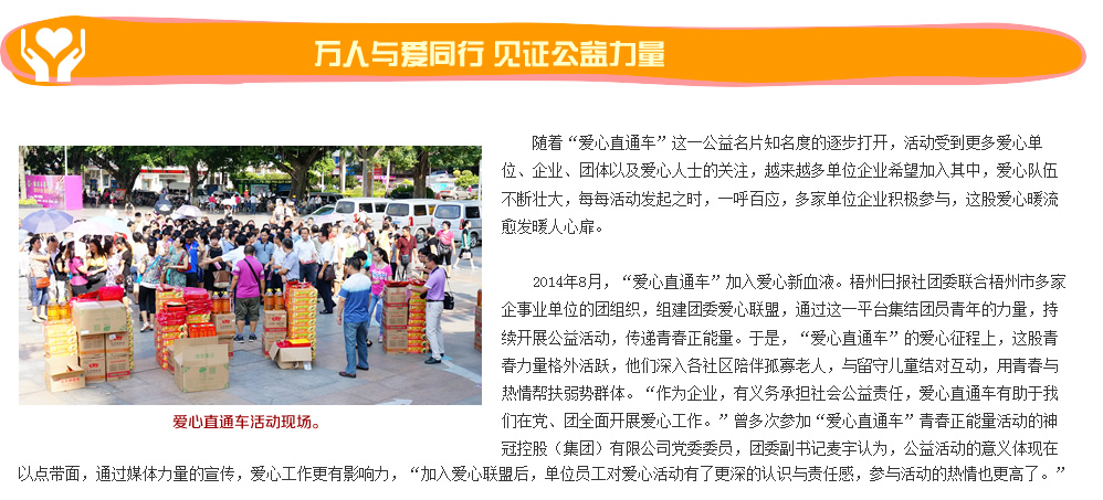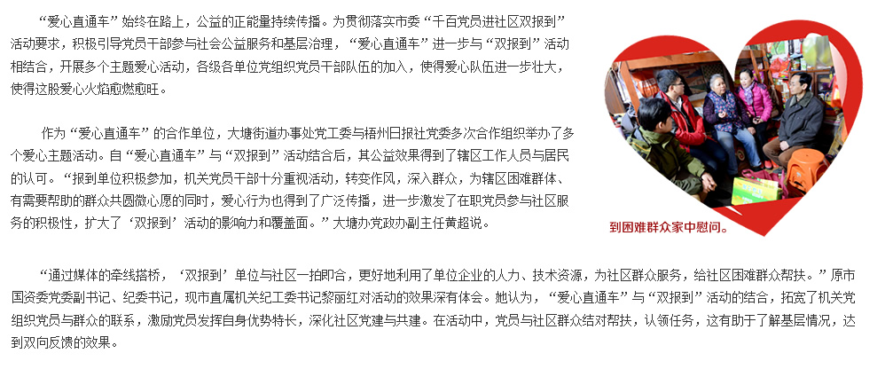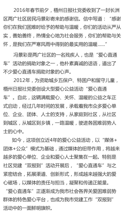 | | 點滴愛心帶來春的溫暖 | | 2015年2月12、13日 | | 羊年春節前,由梧州日報社主辦的“愛心直通車”送溫暖活動趕在年前走村進戶,為留守兒童、困難家庭、孤寡老人送去愛心物資,送上力所能及的幫助。 | |  | | 愛心物資資助困難群眾 | | 2015年2月7日 | | “愛心直通車——我們一起送溫暖”之助圓微夢想,送溫暖活動長洲區站在市政廣場隆重舉行。各個愛心單位、愛心企業代表將物資贈送給倒水鎮4個村并對困難家庭進行慰問。 | |  | | 份份牽掛點點愛心溫暖困難群眾 | | 2015年2月6日 | | “愛心直通車——我們一起送溫暖”之“情系村(居)送溫暖”活動萬秀區站啟動儀式在鴛江麗港廣場隆重舉行。儀式啟動后愛心代表帶著愛心物品探訪困難群眾。 | |  | | 問候與祝福傳遞融融暖意 | | 2015年2月6日 | | 2月6日市四家班子領導分頭走訪慰問老黨員、困難黨員、困難勞模、困難職工、五保戶、低保戶、孤兒、優撫對象、復退軍人等,為他們送去黨和政府的真切關懷和新春祝福。 | |